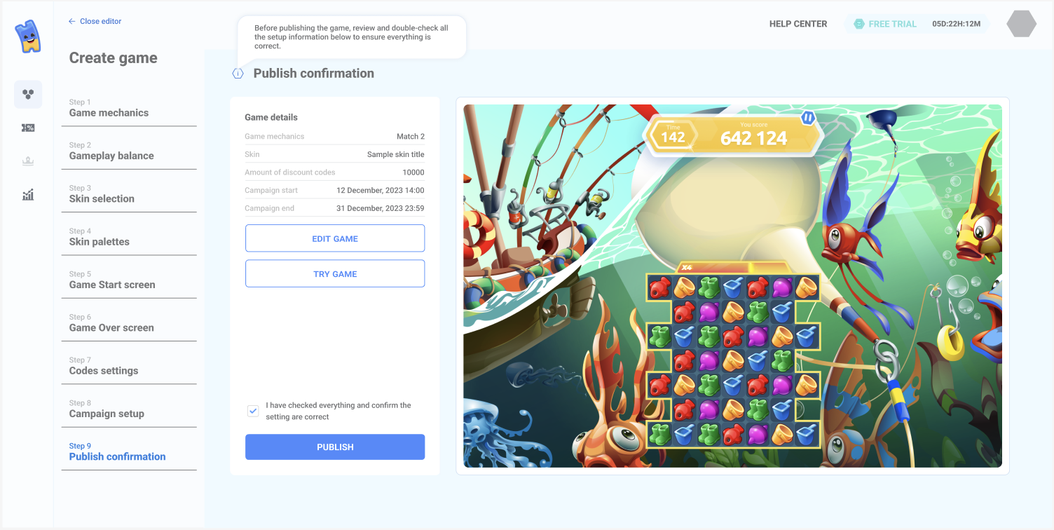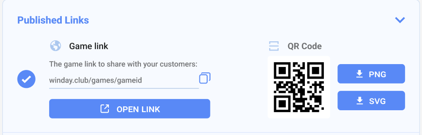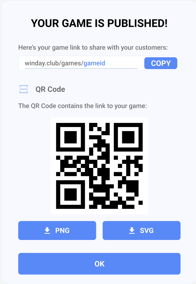 To get the QR code, you need to publish the game (Step 9: Publish Confirmation).&#x20;